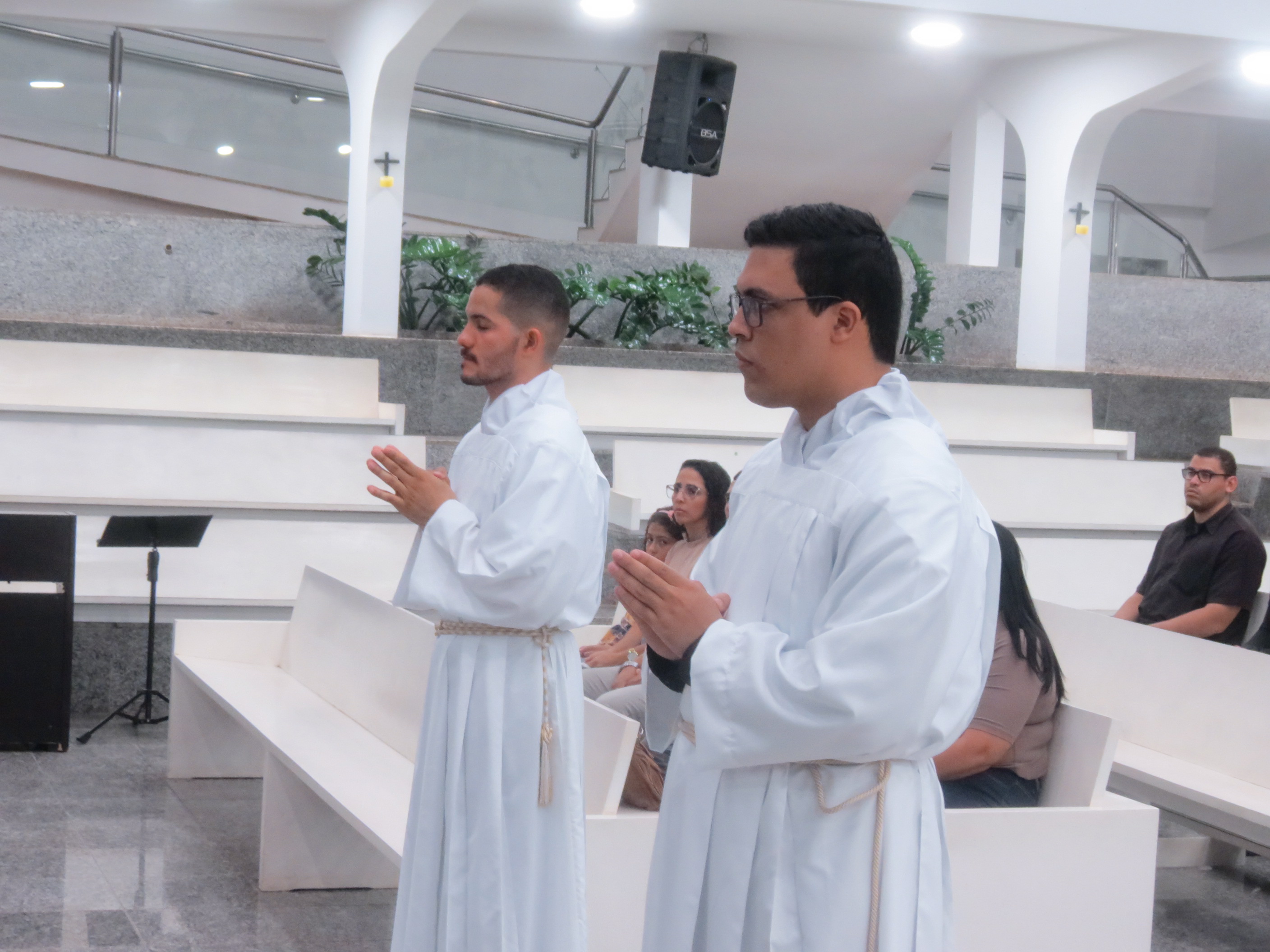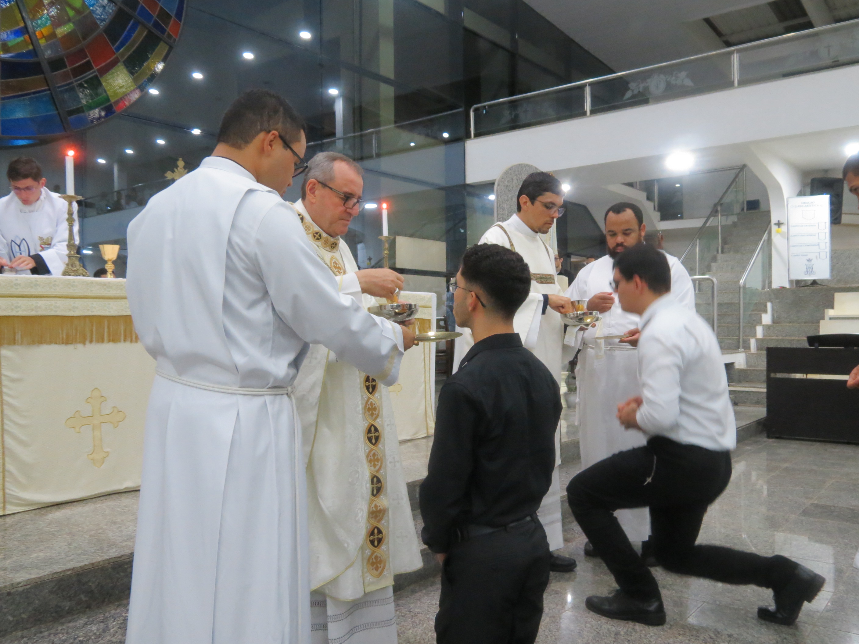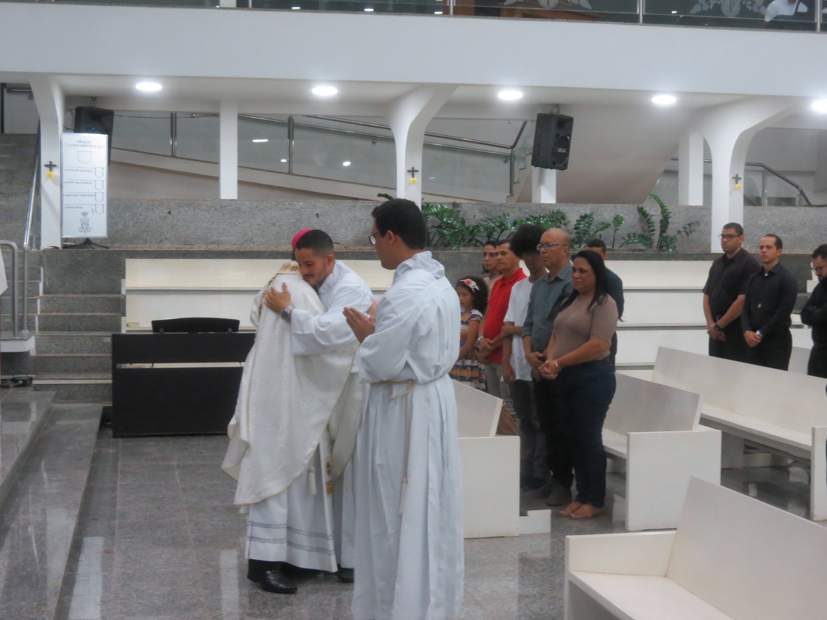 Na última segunda-feira (17), nosso seminário foi palco de um momento especial: dois seminaristas da Arquidiocese de Brasília, Hélcio José Ferreira Gomes Júnior e Luiz Felipe Muniz dos Santos, do 1º ano de Teologia (Configuração), deram um importante passo em sua caminhada vocacional ao serem admitidos como candidatos às Ordens Sacras, durante solene Celebração Eucarística, presidida por Dom Antônio Aparecido de Marcos Filho, Bispo Auxiliar de Brasília.